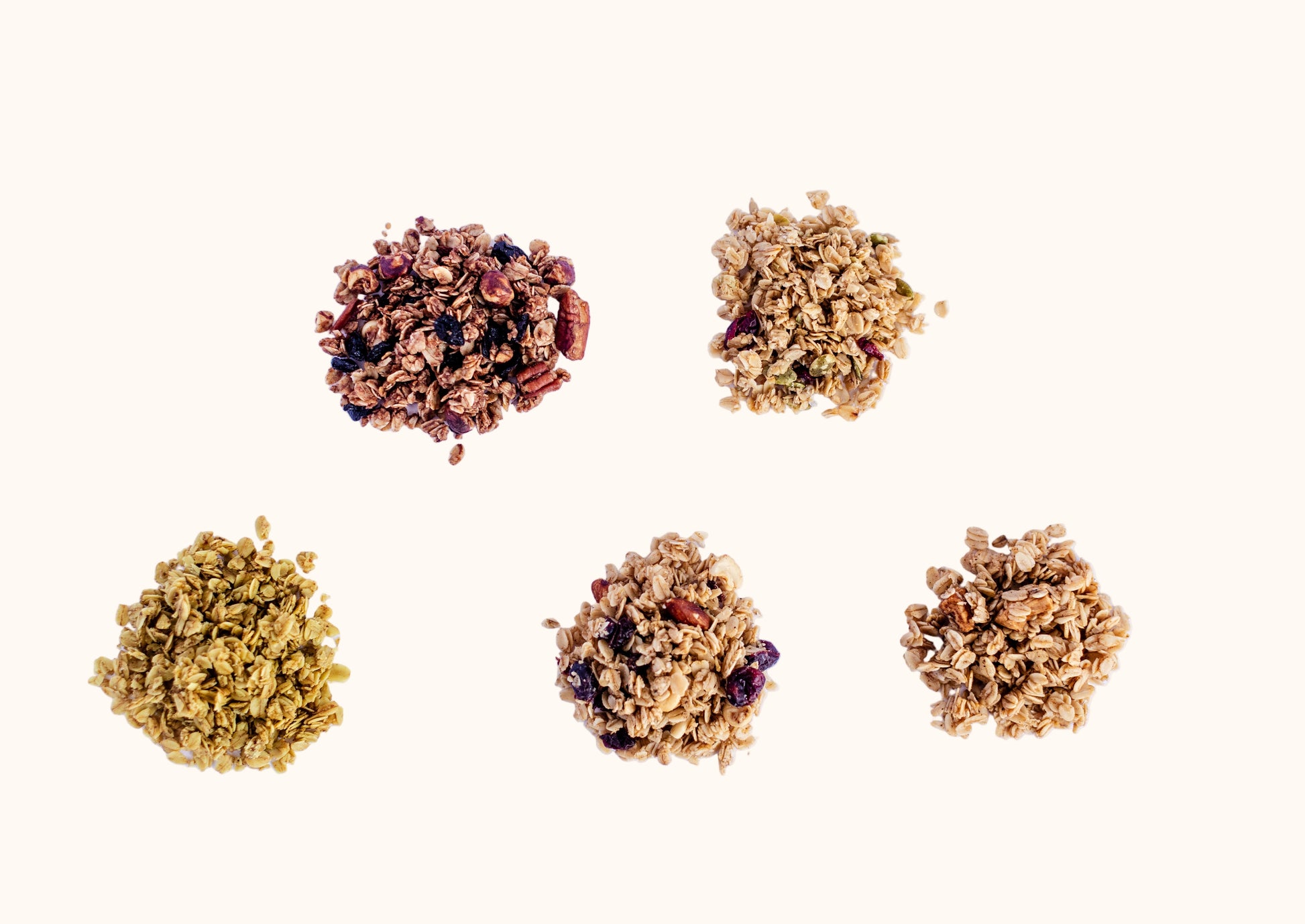 Taste all of the deliciousness of Ms. P's Gluten-Free Granola by purchasing this small bundle where you get one of each of our five flavors. One Cinnamon Apple, one Matcha Turmeric, one Berry Nutty, one Harvest Blend and one Chocolate Hazelnut Pecan. Determine your favorite and continue to snack happily!