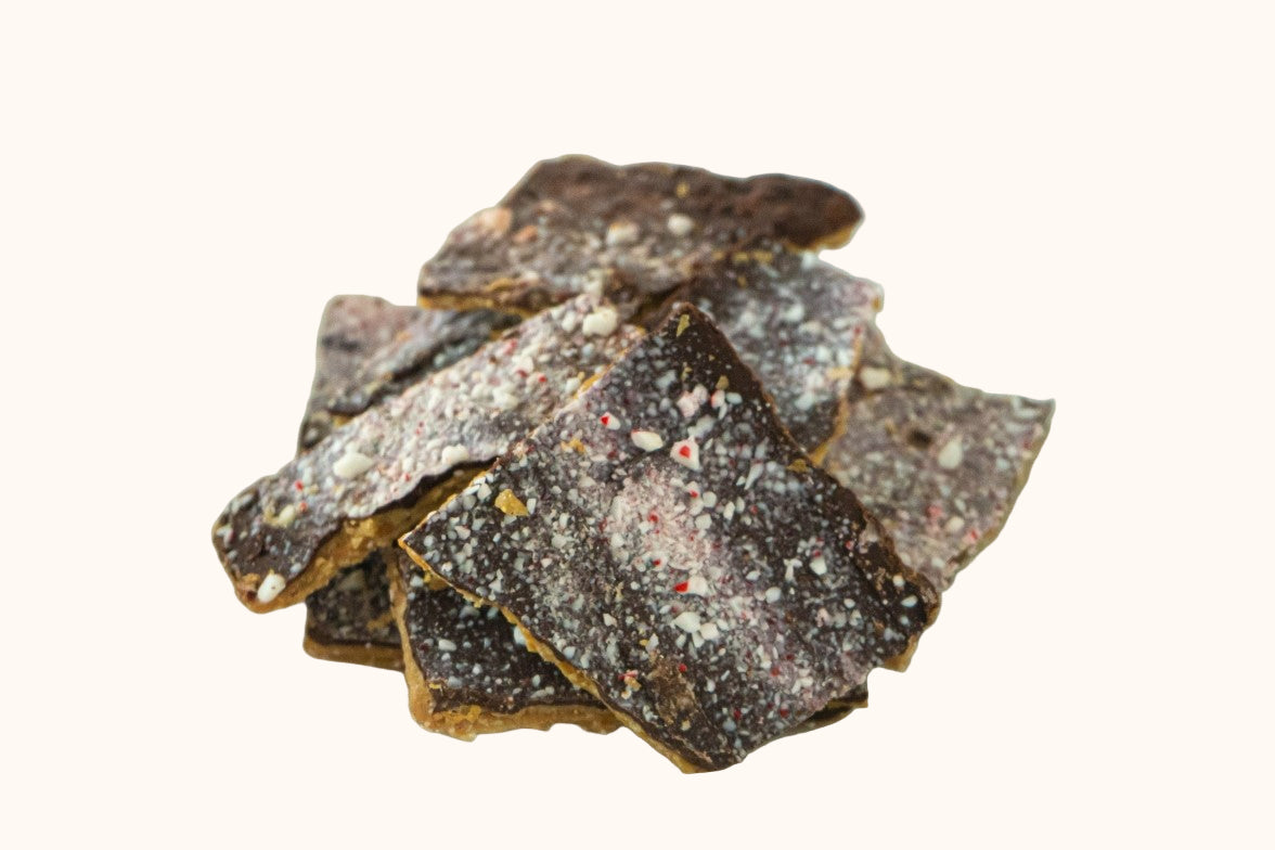 Handmade with creamy butter, organic brown sugar, and a layer of crisp gluten-free crackers, this irresistible toffee is coated in rich semi-sweet chocolate and sprinkled with crushed peppermint for the perfect sweet-and-cool crunch. Each bite melts into a symphony of buttery caramel, smooth chocolate, and refreshing mint, capturing the joyful spirit of the season in one delicious moment.